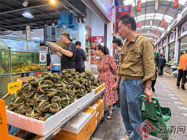 r步入昆明东华农贸市场,扑面而来的是浓浓的节日气息。在水产区,大闸蟹摊位人气尤为旺盛,不少顾客围聚在摊前仔细挑选,询价声、称重声此起彼伏,不绝于耳。据摊主介绍,近期大闸蟹销量明显上升,已成为市场中的消费亮点。与此同时,水果摊位与烧腊档口前也排起了长队,新鲜的应季水果与各式特色熟食备受市民青睐,这番供销两旺的热闹景象,正是昆明城里一幅最为典型的节日民生图景。